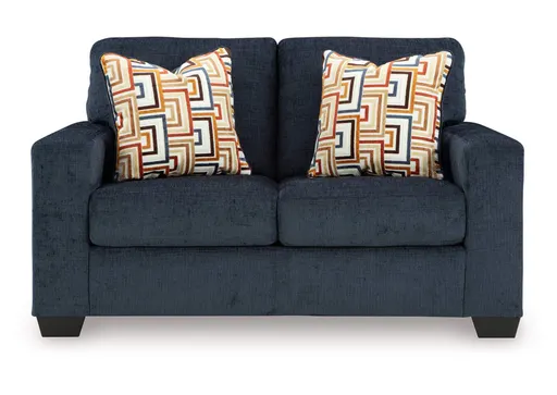 Looking to make a bold statement with color? Liven up your living room with the Aviemore loveseat. Its trend-right navy blue upholstery adds a playful pop of color to your decor. Bold and eclectic accent pillows complete the look. Pairing posh style with everyday comfort, this piece is a welcome addition to contemporary spaces.