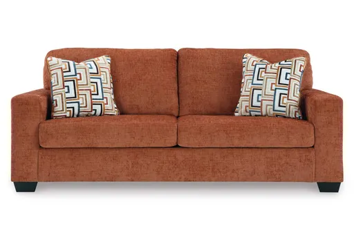Looking to make a bold statement with color? Liven up your living room with the Aviemore queen sofa sleeper. Its trend-right burnt orange upholstery adds a playful pop of color to your decor. Bold and eclectic accent pillows complete the look. Pairing posh style with everyday comfort, this piece is a welcome addition to contemporary spaces. And the queen memory foam pull-out mattress comfortably accommodates overnight guests.