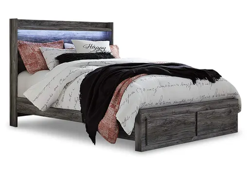 Rest in the casually cool style and practicality of the Baystorm queen panel storage bed. Its driftwood and smoky finish gives this bed an easy-going vibe that's perfect for creating a relaxed getaway in the room. Two underbed storage drawers provide ample room for stowing away spare bedding and more. Clean lines and modern charm blend for a fuss-free look. Included slats eliminate need for foundation/box spring. Mattress sold separately.