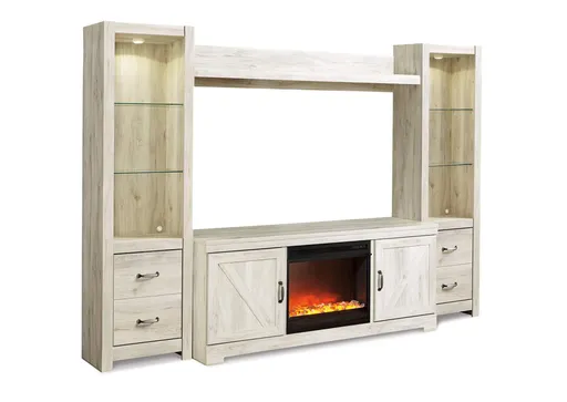 Express your farmhouse style with this entertainment center with fireplace insert. Its wispy white finish over replicated oak wood grain is a delightful change from the ordinary. Clean-lined, classic styling with barn door inspiration provides a country chic aesthetic that’s a breath of fresh air. Adding that much more show-stopping style, the electric fireplace insert operates with or without heat and includes a six-level temperature setting, a remote control and an overheating control for added safety. It comes with faux glass crystals and natural stones, so you can customize the look of the flame bed.
