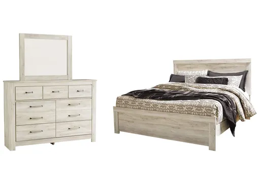 Gorgeous and modern, the Bellaby bed, dresser and mirror express your farmhouse style. Wispy white finish over replicated oak wood grain infuses so much character for a weathered, rustic look you’ll love. Clean-lined, classic panel styling provides a country-chic bedroom retreat that’s a breath of fresh air and provides the perfect foundation for an inviting space.