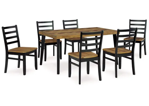 Transform your dining area into a delightful rustic retreat with the Blondon seven-piece table set. A two-tone finish adds a layer of charm, creating a visually appealing look that catches the eye. The tabletop's inlay chevron pattern adds a unique and stylish touch, while ladderback chairs complement the overall design.