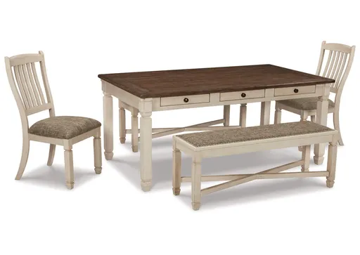 Enjoy beautiful cottage style with the classic Bolanburg dining table set. With a rustic planked top, this table serves up casual with a vintage twist. The gently distressed tabletop, paired with the rake-back design of the chairs and upholstered benches in a textured antique white finish, is a perfect set for impromptu gatherings. With six built-in drawers, you can keep placemats, napkins and utensils on hand for maximum practicality in any living space. For a quaint ensemble you're bound to love, choose this Bolanburg set.