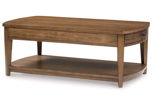 Serving up transitional style at its best, the striking Burkbyer coffee table looks equally at home in traditional and modern settings. Its classic brown finish merges effortlessly with a softly rounded top and tapered legs for a timeless contemporary vibe. A lower shelf beautifully accommodates baskets, magazines, plants and more, while two end drawers keep entertainment essentials close by.