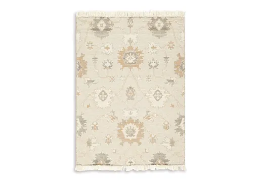 Bring modern life into balance with the rhythms and beauty of nature. The Calkin area rug has the vintage look of an heirloom. Blooming with graceful florals in neutral tones and surrounded by fringe edging, it adds style to any lounge space.