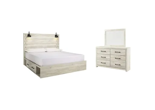 Cambeck King Panel Bed with 4 Storage Drawers with Mirrored Dresser
