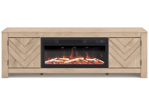 The Cayboni TV stand with electric fireplace embraces a classically charming aesthetic and repurposes it for modern living. Its light replicated wood grain appeals to your love of vintage character, while the chic chevron pattern is effortlessly on trend. Media accessories stay tucked away in style with hidden storage behind the doors. And for added ambiance, the electric fireplace brings a cozy-cool vibe to your living room. With the touch of a button, activate the LED-lit flame and adjust the temperature or the flame brightness. The flame effect includes multiple color options and a realistic-looking faux birch log set.