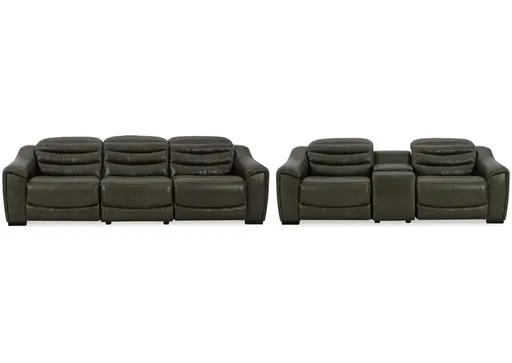 For those seeking to curate a living room retreat that offers superior comfort and a contemporary aesthetic, this sleekly designed power reclining seating package will become your favorite source of at-home serenity. Rest on combination leather/faux leather upholstery, and use the one-touch power controls to recline and adjust the headrests with ease. As you recharge after a long day, your devices can too with USB charging. This set is visually enticing in a luxe dark gray, with slope track arms and stitched detailing on the back to enhance its modern appeal.