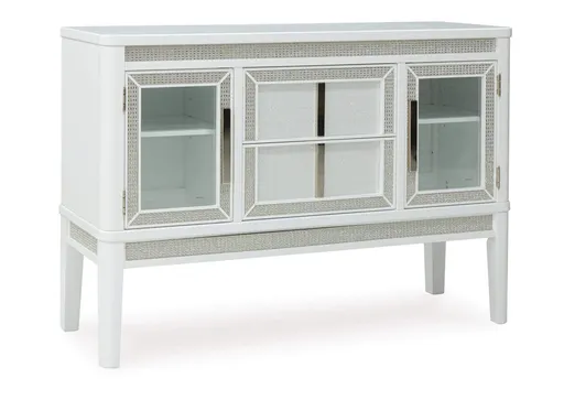 Embracing modern glamour, the Chalanna server is a sparkling addition to your dining area. The bright white lacquer finish, shimmering rhinestone accents and glass panel doors give this piece plenty of polish. Discreetly placed along the upper valance, white LED lighting adds the perfect finishing touch.