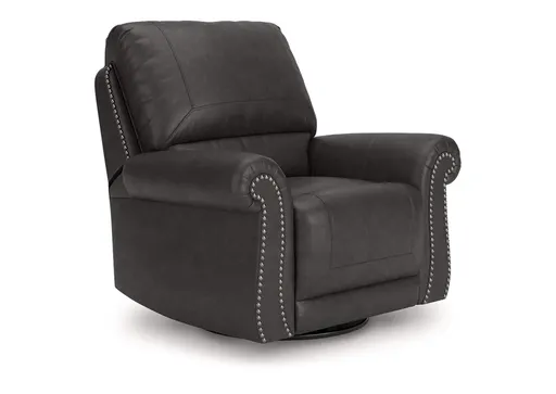 Everyone can have the best seat in the house with this swivel glider recliner. Its nailhead trim puts the finishing touches on the traditional roll arms you love. The recliner's comfy, durable cushions—wrapped in a rustic yet sophisticated faux leather—keep you feeling relaxed, while its turned legs show that style and quality flow from top to bottom. Plus the smooth reclining motion and 360-degree swivel keep you in the flow of conversation.