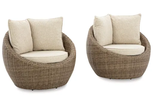 The Danson swivel lounge chair completes your outdoor seating area with its fresh take on casual comfort. Handwoven resin wicker over a curving aluminum frame balances streamlined style and exceptional durability. High-performance beige Nuvella+™ fabric wraps the seat and back cushions, protecting against the natural elements.