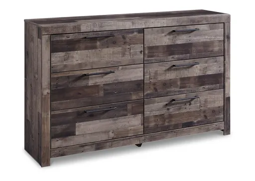 Modern yet hefty. The Derekson dresser makes an urban eclectic statement. Seasoned raw wood look merges with the clean lined design we love today. Muted rustic finish over replicated pine grain maintains its authenticity. Roomy drawers are flanked with attractive framed front and pilasters. Handles with antiqued gunmetal finish complete this beauteous look with easy to pull function.