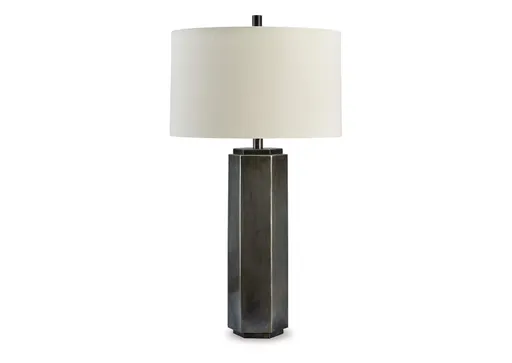 Why settle for standard light fixtures when the Dirkton table lamp adds so much warmth and style? The hexagon-shaped lamp features an antiqued pewter-tone and black finish topped with a drum shade. Whether lighting a living area, bedroom or entryway, this piece will steal the spotlight wherever it lands.