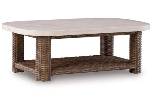 Get back to nature with the relaxed styling of this outdoor coffee table. Crafted with a sturdy aluminum frame and resin wicker, it offers exceptional durability and style. A smooth tabletop with softly rounded edges holds nibbles, sips and more. And don't forget the handy lower shelf. Sounds like fabulous form and function to us.