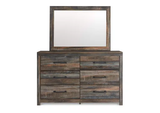 When merged in just the right way, rustic and industrial styles can make one happy marriage. Case in point: the Drystan dresser and mirror set. A refined take on barn board beauty, its complex, replicated wood grain showcases hints of burnt orange and teal tones for a sense of weatherworn authenticity. Elongated metal drawer pulls elevate the aesthetic.