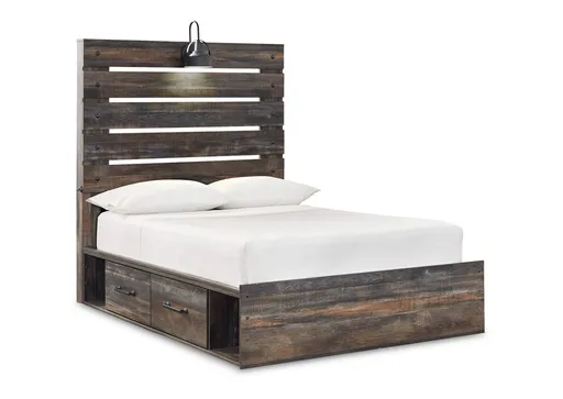 When merged in just the right way, rustic and industrial styles can make one happy marriage. Case in point: the Drystan full panel bed with storage. A refined take on barn board beauty, its complex, replicated wood grain showcases hints of burnt orange and teal tones for a sense of weatherworn authenticity. Love to read in bed? You’re sure to find the retro-chic light sconce and USB plug-ins on the open-slat style headboard such a bright idea. Underneath the bed: smooth-gliding drawers and open cubbies that accommodate casually cool storage bins.