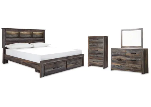 The Drystan king-size bookcase bed with storage, dresser, mirror and chest of drawers is a refined take on barn board beauty. Its complex, replicated wood grain showcases hints of burnt orange and teal tones for a sense of weatherworn authenticity. Three open cubbies lined with a dimming LED light strip keep bedtime reads top of mind. Double drawers at the foot of the bed come in mighty handy. The dresser with six smooth-gliding drawers and chest with five smooth-gliding drawers are lined with faux linen laminate with industrial dark-tone hardware completing this rustic and industrial style bedroom. Mattress and foundation/box spring available, sold separately.