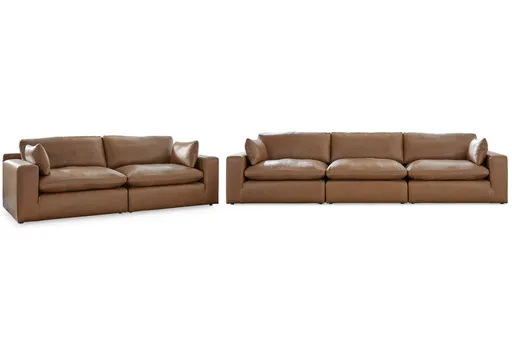 Catering to your contemporary lifestyle, this modular seating package is a handsome marriage of masculine and feminine sensibilities. Feather-fiber cushions and bolster pillows soften the look of its chunky, linear silhouette. A warmly hued combination of leather and faux leather upholstery levels up the affordable luxury. And you'll never run out of ways to stage this seating arrangement—each piece is fully finished on all sides and capable of standing solo. Urban sophistication has never been more versatile.