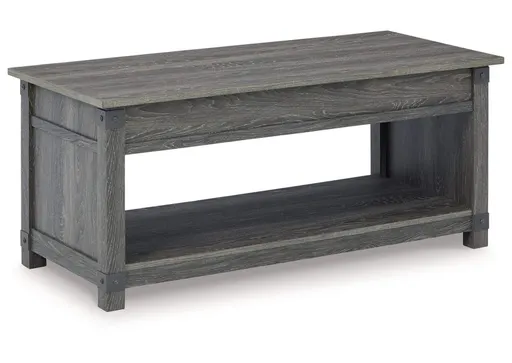 Open the door to modern farmhouse style with the Freedan lift-top coffee table. The beautiful woodgrain look and classic crossbuck metal accents are a cool touch, while the lower shelf provides surface space for fashionable home accessories. Sporting a gray replicated wood grain effect, its handy spring-loaded mechanism brings the tabletop closer to you. This versatile table makes it easier than ever to eat, work or play from the comfort of your sofa.