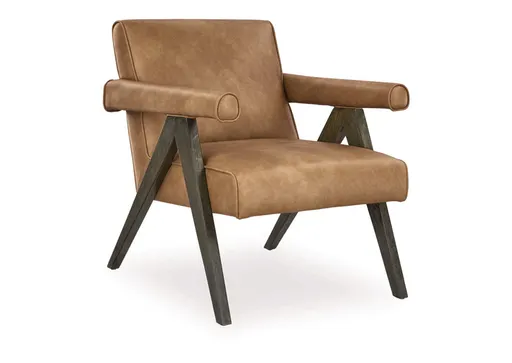 Indulge in the captivating Goda accent chair. The caramel-colored faux leather offers a smooth and inviting feel, creating a beautiful contrast with espresso-finished solid wood legs. This chair isn't just a piece of furniture; it's an invitation to relax in high-end style.