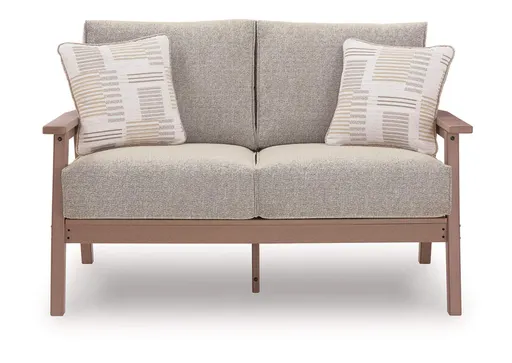 Natural neutrals are all the rage. Embrace the style trend with this outdoor loveseat. Crafted with MEGA-TUFF™ HDPE material, this chair combines the exceptional durability and weather resistance you need with the wood look you love. Comfy cushions wrapped in our high-performing, low-maintenance Nuvella® fabric offer stylish and durable appeal, taking outdoor living to a whole new level. Coordinating accent pillows add a wonderful layer of interest.
