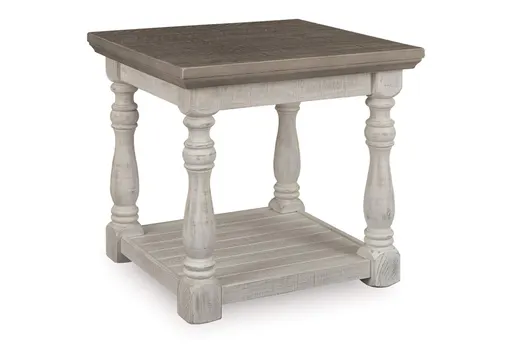 With its richly rustic finish and textural mix, the Havalance end table goes to town on bygone beauty. Its distressed two-tone treatment blends a weathered gray with vintage white for an utterly charming effect. Robust legs lend a hearty, substantial look that feels right at home.