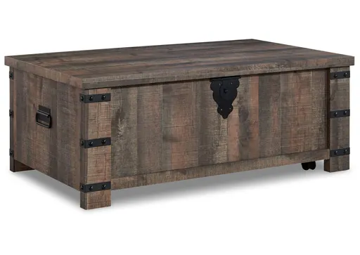 Keep your aesthetic chic and approachable with the charming Hollum coffee table. This piece has an effortless beauty, with a replicated aged barn wood pattern and matte black metal accents adding vintage-inspired elegance. Combining elements of fashion and function, the lift-top design offers a table area for dinner and a movie or working from home on your laptop.
