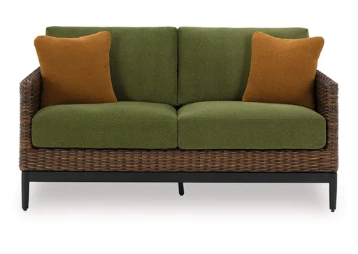 The Horizon Hall outdoor loveseat recalls the aesthetics of nature to bring an inviting, high-style feel to your patio or lanai. Its Nuvella+™ performance fabric is made with enhanced UV resistance, so the chic green hue stays brighter for longer. Worried about the weather? Don't sweat it—the durable resin wicker withstands the elements from season to season.