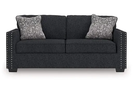 The stunning Jasmine Peaks sofa leaves a lasting impression. Its cozy cushions, chic coal-colored upholstery and striking nailhead trim are a perfect blend of comfort and contemporary design. And here’s the showstopper—ambient red, white and blue LED lighting along the sofa's base. The look is simply wow.