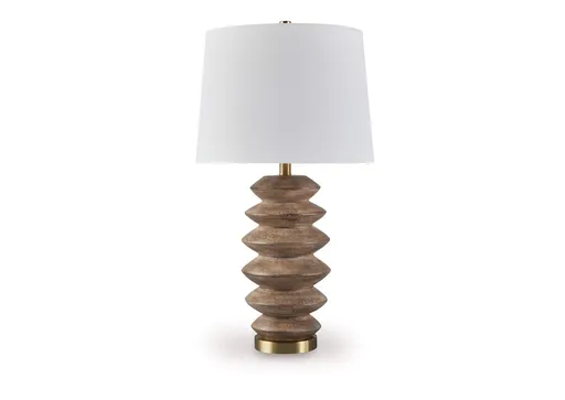 Express your taste for cool construction and inviting vibes. In a light brown faux wood pattern, the Jyllyard table lamp brings a fresh feel to an end table or nightstand. A goldtone metal accent gives it a mixed-media feel for added refinement.