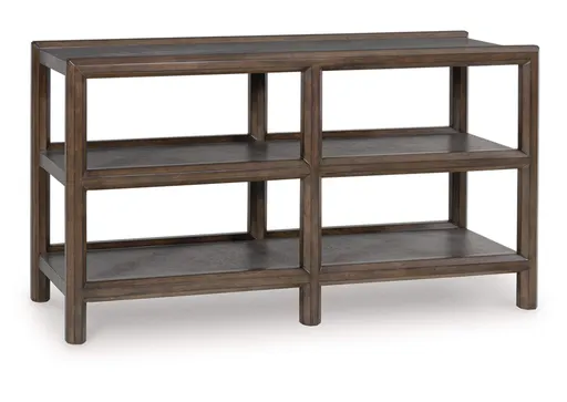 Master the art of mixed-material design with the Kallenny sofa table. It sports an urban vibe, with faux cement lending an industrial edge to the contrasting dark brown finish. For a functional touch, lower shelves showcase your decor in style. Detailed mouldings on the side add even more cool character.