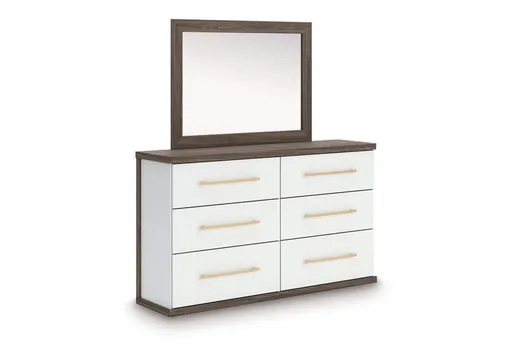 Looking to make a subtly striking statement in your bedroom? We've got you covered. A sophisticated two-tone treatment on this dresser with mirror marries a warm brown finish over replicated walnut grain with a matte white finish. The dresser's rounded corners and thick top radiate an air of modern panache, while sleek handles in a champagne finish add a sparkling touch to the spacious drawers. It’s a master class in contemporary yet comfortable character.