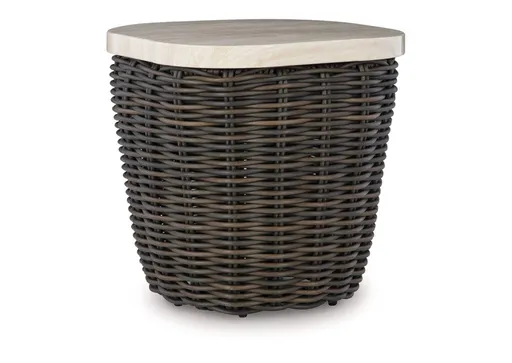 Add luxury, convenience and durability to alfresco fun. The Kimora outdoor end table captures the textural beauty of wicker while withstanding the elements, from rain to shine. With its marble-look aluminum top, you can stylishly keep your pool-side drinks or reads in reach.