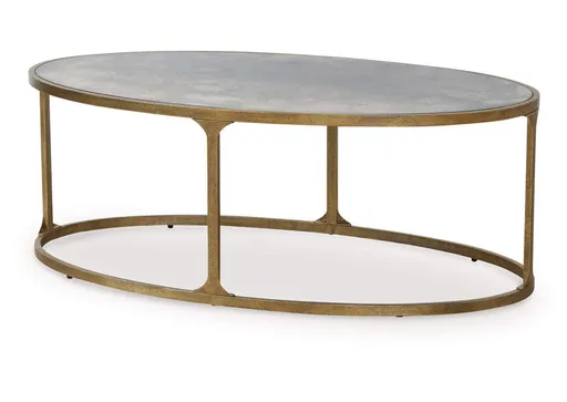 The Korajane coffee table blends a traditional feel with contemporary design cues. Antiqued gold texturing on the frame has the look of timeworn, hand-forged metal. A tempered glass top with a faux marble finish provides a refined contrast. Chic when hosting decor or holding entertainment essentials, this table rounds out your living room with transitional flair.