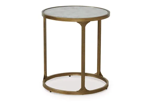 The Korajane end table blends a traditional feel with contemporary design cues. Antiqued gold texturing on the frame has the look of timeworn, hand-forged metal. A tempered glass top with a faux marble finish provides a refined contrast. Chic when hosting decor, a lamp or holding entertainment essentials, this table rounds out your living room with transitional flair.