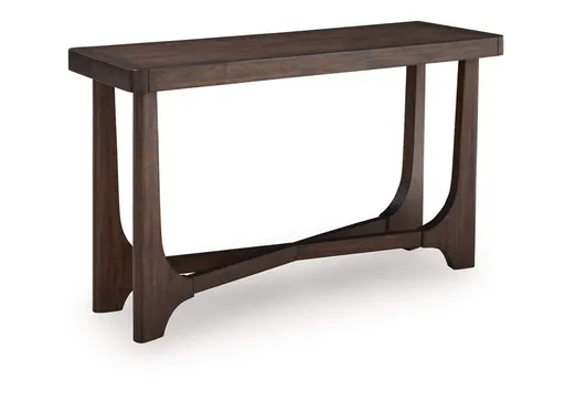 Master the art of casual contemporary design with the Korestone sofa table. Its softly rounded wood frame top pairs perfectly with an eye-catching double wishbone base and a rich brown finish for a decidedly here and now vibe. Talk about the ideal spot for decor, plants and more.