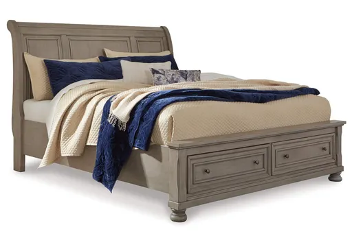 Satisfying your taste for tradition, the Lettner queen sleigh bed with storage sports serene sophistication. Forever classic design details—inlaid panels, silvertone patina hardware and bun feet—are so easy to love. Burnished light gray finish elevates the look with modern sensibility. Two roomy drawers keep your essentials organized in style. Mattress available, sold separately.