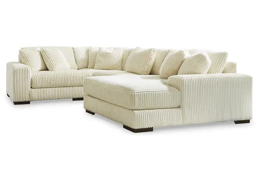 Plush and posh. Showcase your eye for on-trend texture with the statement-making cord upholstery of the Lindyn sectional with chaise. Its stunningly soft fabric entices in an ivory hue, complementing contemporary color palettes. Sink into the cushions and plan to stay a while—this cozy living room centerpiece highlights your high-end approach to comfort and style.