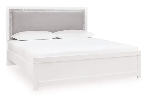 For those with a penchant for modern glamour, this king upholstered panel bed reflects your upscale taste. It’s dressed in a crisp matte white finish, with an upholstered panel softening the look. Seamlessly incorporated LED accent lighting on the headboard provides practical and stylish illumination.