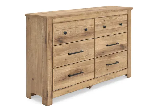 Looking to create a bedroom that feels airy and beautifully put together? This casually comfy dresser is your perfect solution. Its clean lines, replicated oak grain and on-trend natural finish exude a charming cottage-inspired feel that brightens your restful retreat. Spacious drawers with dark bronze-tone knobs stow away clothes and more. Now there’s a fresh take on country living we can get behind.