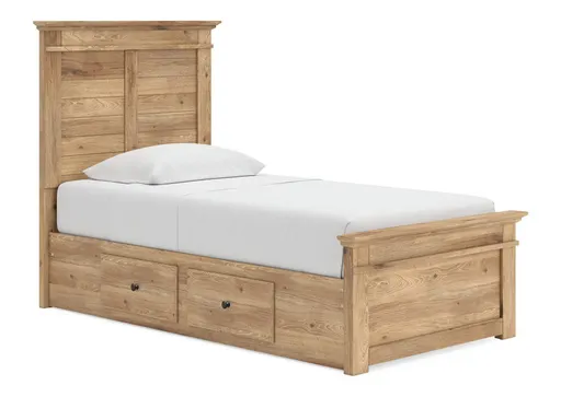 Looking to create a bedroom that feels airy and beautifully put together? This casually comfy twin panel storage bed is your perfect solution. Its clean lines, replicated oak grain and on-trend natural finish exude a charming cottage-inspired feel that brightens your restful retreat. Spacious drawers with dark bronze-tone knobs stow away clothes and more. Now there’s a fresh take on country living we can get behind.