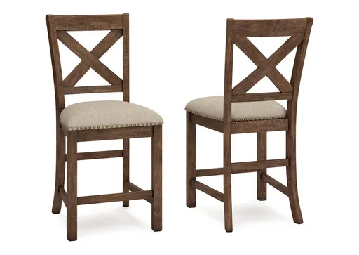 The Moriville upholstered bar stool might be simple at first sight, but a closer look reveals beauty in the details. With a distressed nutmeg finish, antiqued nailhead trim and textured polyester upholstery, it’s beaming with charm. Cushioned seat ensures long, lingering meals are enjoyed in comfort.