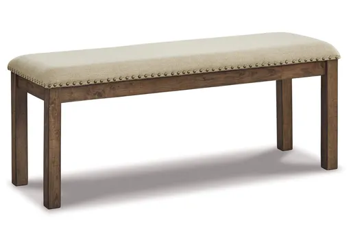 Moriville upholstered dining bench elevates the art of casual rustic style. With a distressed nutmeg finish, antiqued nailhead trim and textured polyester fabric, this upholstered dining bench entices with warmth and earthy elegance. Cushioned seat accommodates lingering meals enjoyed in comfort.