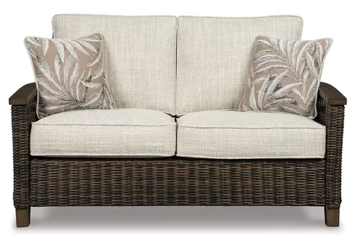 Pretty enough for trendy interiors, yet durable enough to weather the elements, the Paradise Trail outdoor loveseat rises to the challenge beautifully. Handwoven resin wicker over rust-proof aluminum merges high style with low maintenance. Rest assured, though the exposed armrests and feet look remarkably like wood, their sturdy aluminum construction is perfectly suited for alfresco living. Plush seat cushions and throw pillows wrapped in high-performing Nuvella® fabric aim to please.