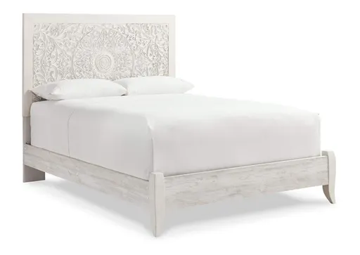 Your young trendsetter can live out her free spirit with the Paxberry queen bed. Exquisite carved medallion pattern is a testament to true style. Charming whitewashed finish sets a foundation for a room bursting with personality. Headboard legs have four height options to grow with your child.