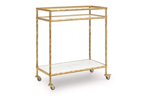 Store and serve in sleek style with the Plattfield bar cart. Its casually cool design combines an antiqued brass-tone frame with white marble and clear glass. Rails on the top shelf help bottles and shakers stay organized. And with its rolling casters, you can make your at-home mini bar mobile and bring the party where your guests gather. It can also act as a cute coffee station—perfect for storing syrups, mugs and other must-haves for your morning brew.