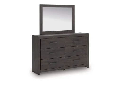 Designed with everyday style in mind, the Prendonea dresser with mirror is a simply chic approach to modern living. A dark charcoal finish blends black and brown undertones, creating a versatile look that effortlessly pairs with your existing pieces. And for must-have function, six smooth-gliding drawers store clothes and linens in charming fashion.