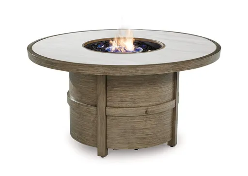 Experience the perfect combination of durability and style with the Rainier Ranch outdoor fire pit table. An aluminum frame with a wood-look finish maintains a sleek, contemporary aesthetic, while the sintered stone tabletop adds an element of natural elegance. A stainless steel burner with glass beads adds a captivating element sure to wow. This delightful addition to your outdoor dining creates an oasis where comfort and beauty thrive.