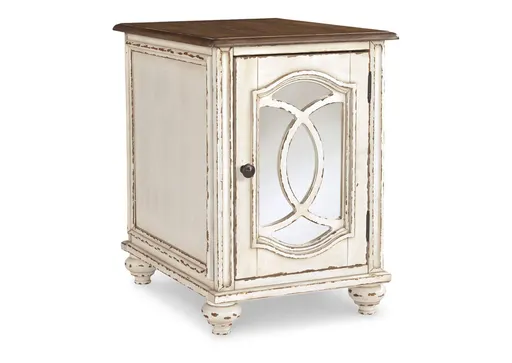 Elevating the art of traditional cottage styling, the Realyn chairside end table is sure to serve you beautifully for years to come. Antiqued two-tone aesthetic blends a chipped white with a distressed wood finished top for added charm. Cabinet door features inset mirror with filigree moulding for a fanciful twist.