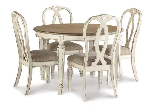 Bon appétit. The Realyn 5-piece dining room set has all the right ingredients for a French country-inspired feast for the eyes. Drop-in leaf allows you to transform the intimate round dining table into a gracious oval table that comfortably seats six. Antiqued two-tone aesthetic pairs chipped white with a distressed wood finished top for a double serving of charm. With its stylized ribbon back design and plushly cushioned seat, this dining room chair is sure to entice you to linger a little longer.